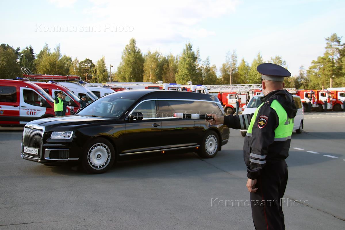 Церемония прощания с министром МЧС России Героем Российской Федерации, генералом армии Евгением Зиничевым в здании "Национального центра управления в кризисных ситуациях России". Жанровая фотография. Автомобиль для траурных церемоний и сотрудник патрульной службы ГИБДД.