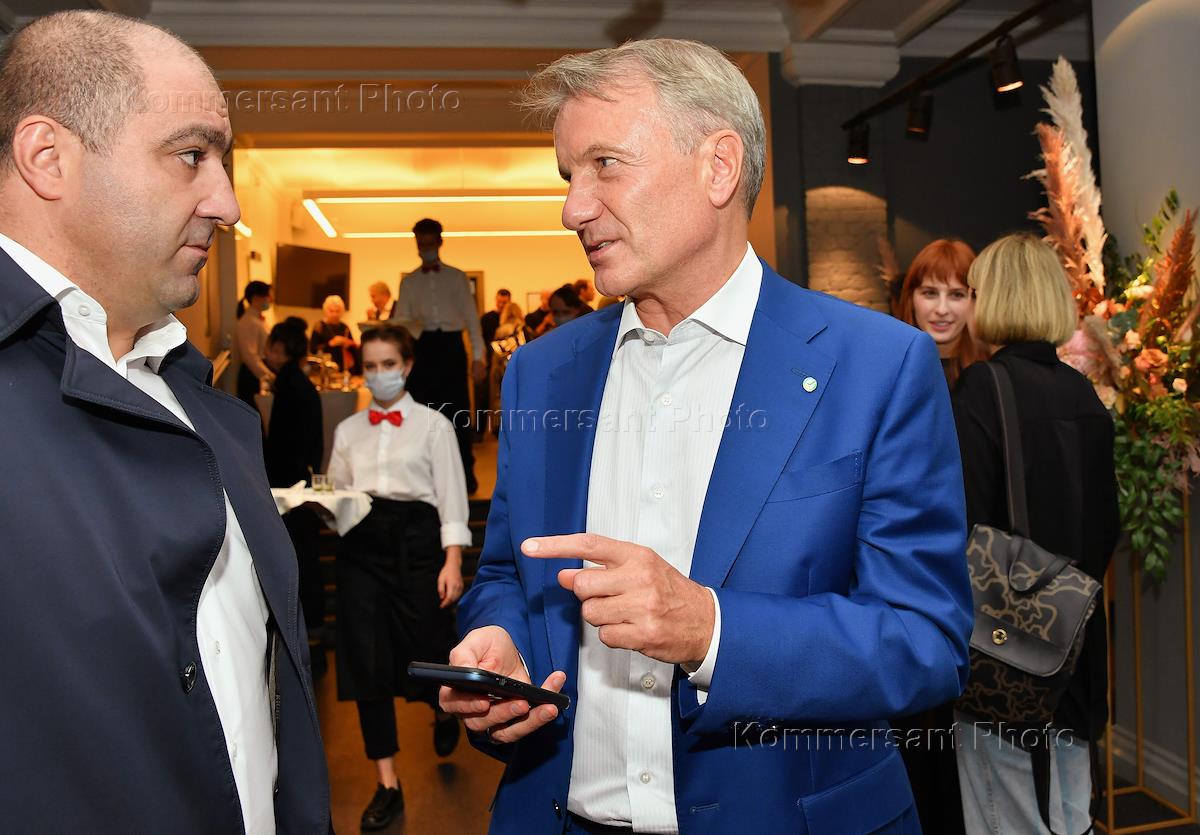 Церемония вручения первой премии Корша, в честь Федора Корша - антрепренера, основателя Русского драматического театра, в театре Наций. Президент, председатель правления Сбербанка России Герман Греф (справа) перед началом церемонии.