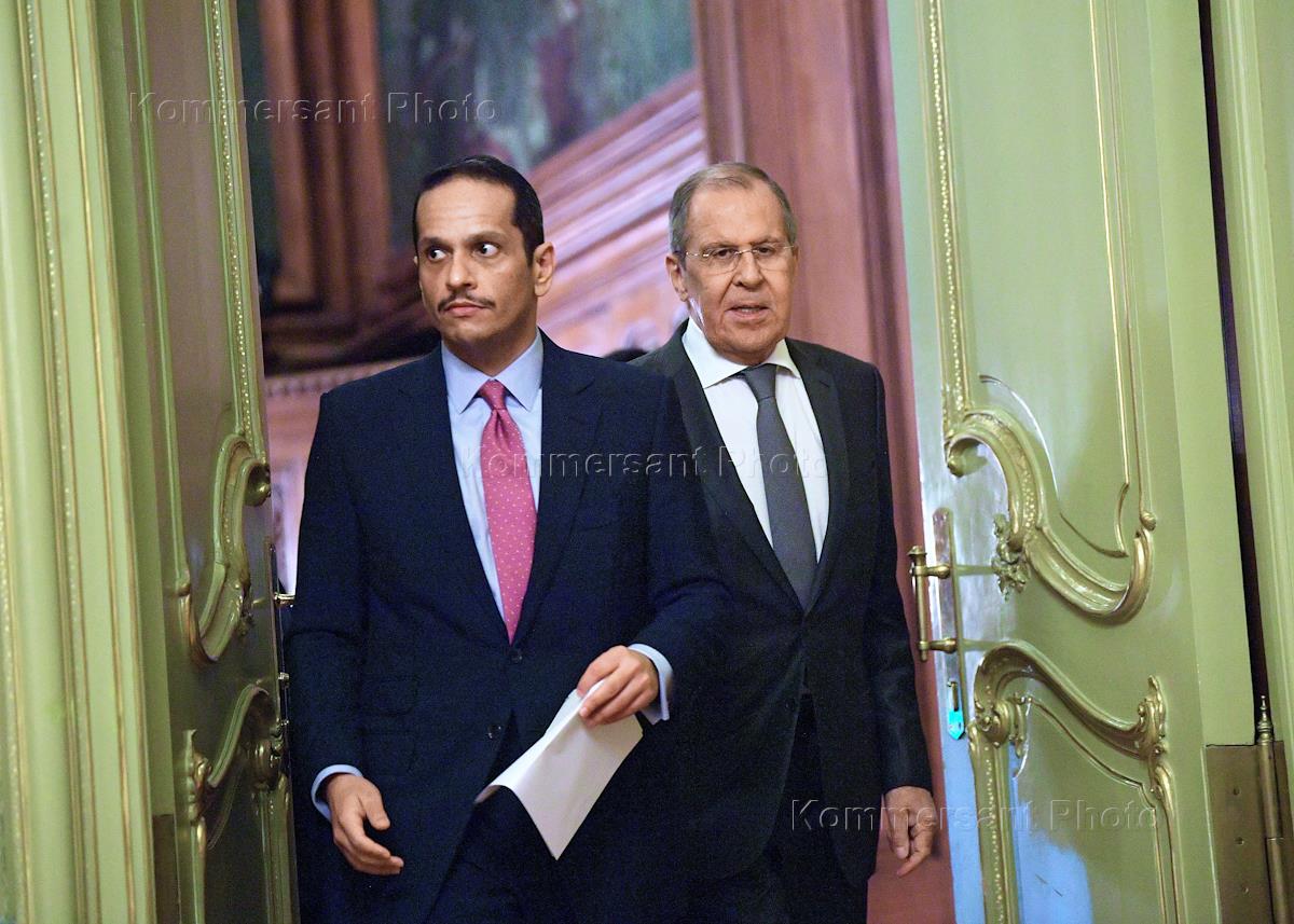 Министр иностранных дел России Сергей Лавров (справа) и заместитель Председателя Совета министров, министр иностранных дел Государства Катар Мухаммед Аль Тани (слева) во время встречи в Доме приемов МИД России.