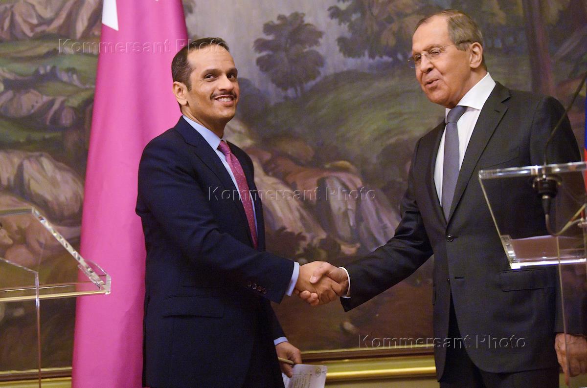 Министр иностранных дел России Сергей Лавров (справа) и заместитель Председателя Совета министров, министр иностранных дел Государства Катар Мухаммед Аль Тани (слева) во время встречи в Доме приемов МИД России.