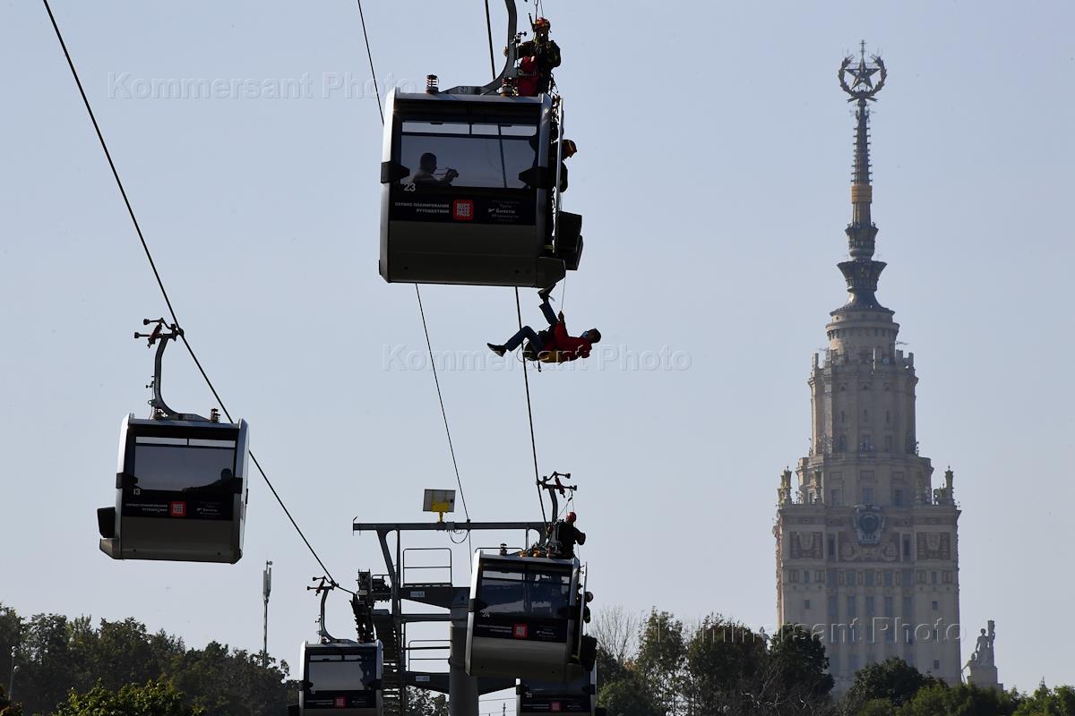 Масштабные учения департамента по делам гражданской обороны, чрезвычайным ситуациям и пожарной безопасности города Москвы на канатной дороге "Лужники-Воробьевы горы" на Лужнецкой набережной.