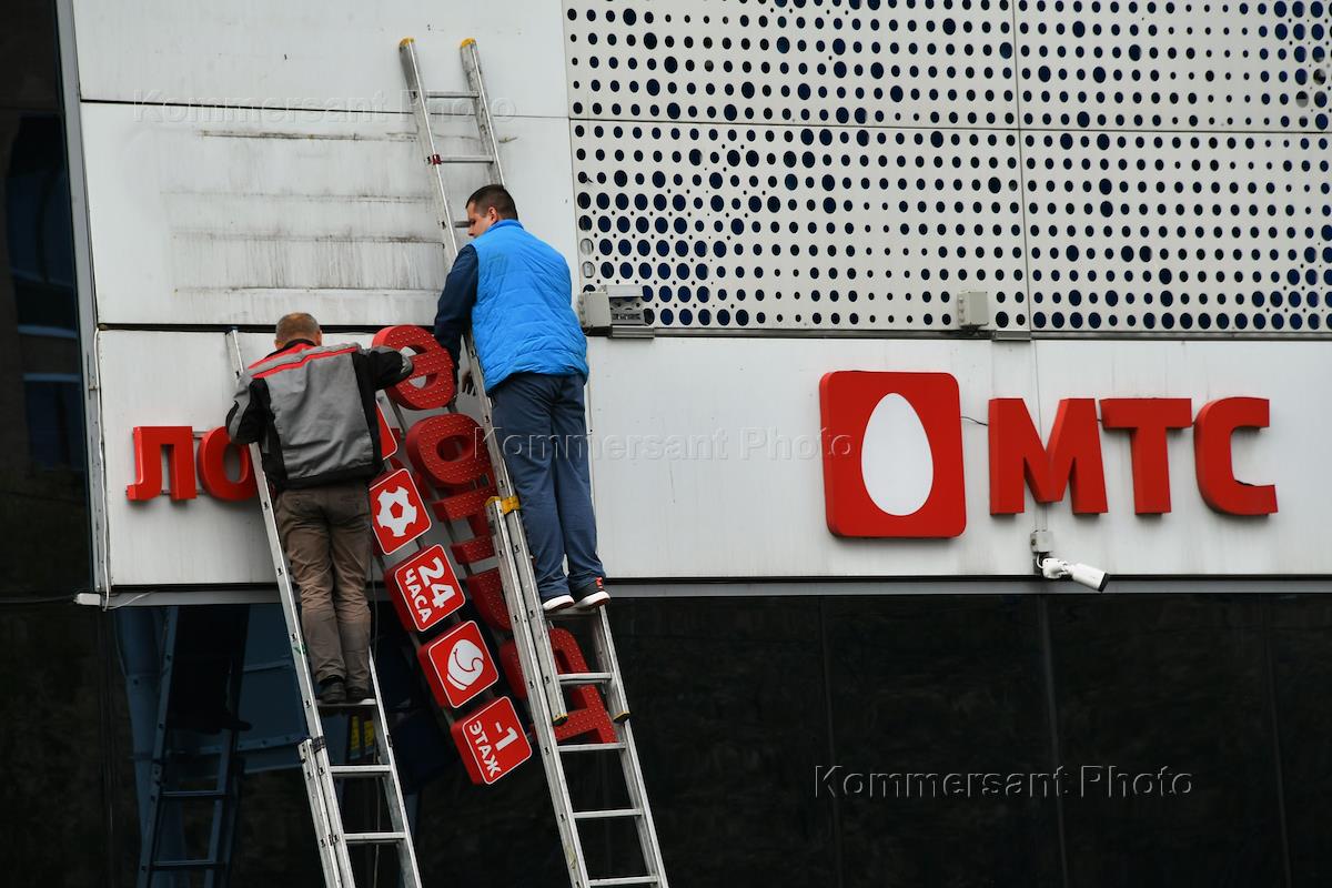 Жанровая фотография. Мужчина устанавливает на лестнице вывеску магазина. Логотип компании МТС.
