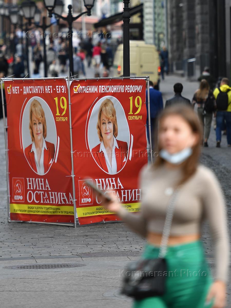 Виды Москвы во время предвыборной кампании в Государственную думу России. Жанровая фотография. Плакаты кандидата в депутаты в Государственную думу председателя Общероссийского общественного Движения "Всероссийский Женский Союз - Надежда России" Нины Останиной в центре города.