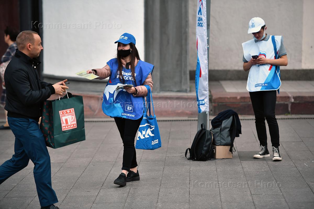 Виды Москвы во время предвыборной кампании в Государственную думу России. Жанровая фотография. Молодой человек во время распространения листовок с информацией о кандидате от партии "Новые люди" на улице в центре города.
