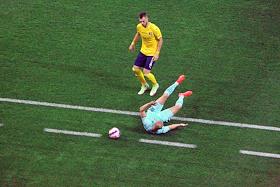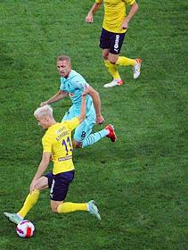 Российская Премьер-Лига (РПЛ). Тинькофф - Чемпионат России по футболу 2021/2022. 7-й тур. Матч между командами "Ростов" (Ростов-на-Дону) и "Краснодар" (Краснодар) на стадионе "Ростов Арена". Игрок команды "Ростов" Понтус Альмквист (слева) и игрок команды "Краснодар" Юрий Газинский (в центре) во время матча.