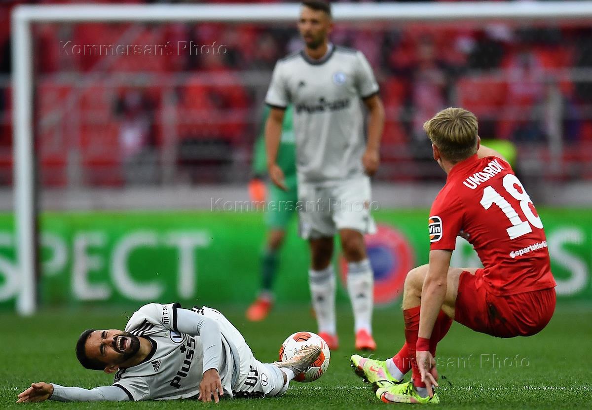 Лига Европы по футболу. Матч между командами "Спартак" (Москва, Россия) - "Легия" (Варшава, Польша) на стадионе "Открытие Арена". Игрок команды "Спартак" Николай Рассказов (справа) и игрок команды "Легия" Махир Эмрели (слева) во время матча.