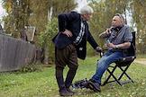Съемки нового музыкального фильма Гарика Сукачева - "Пой, ветер" в Тверской области. Актер Василий Мищенко (слева) и музыкант, режиссер Гарик Сукачев (справа) во время съемок.
