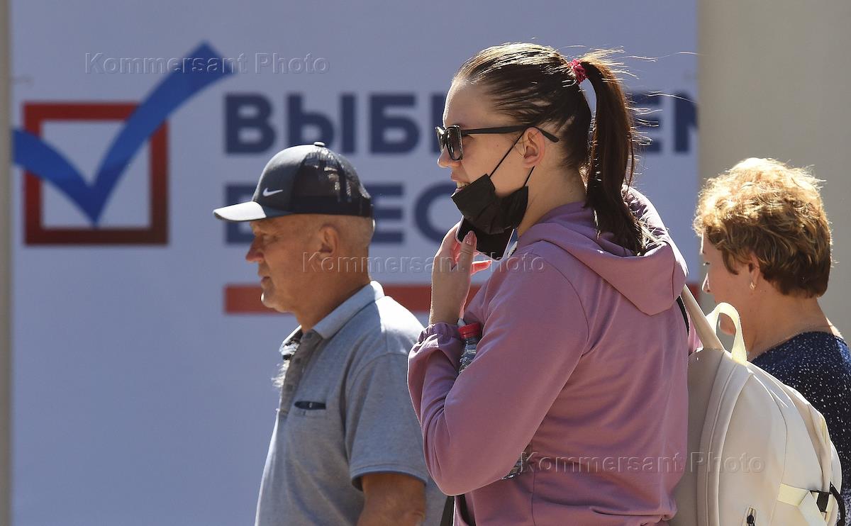 Виды Симферополя во время предвыборной кампании в Государственную думу России. Жанровая фотография. Прохожие на фоне агитационного плаката Единого дня голосования.