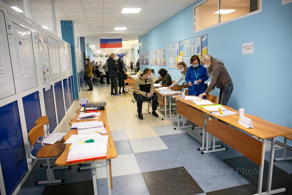 Elections of deputies of the State Duma of Russia of the eighth convocation and combined with them elections and referendums in the constituent entities of the Russian Federation. Genre photography. Voters during voting at a polling station.