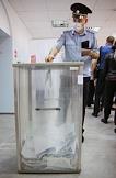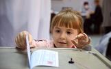 Выборы депутатов Государственной Думы России восьмого созыва и совмещенных с ними выборов и референдумов в субъектах Российской Федерации. Жанровая фотография. Ребенок опускает бюллетень на избирательном участке в помещении Ростовского автодорожного колледжа.
