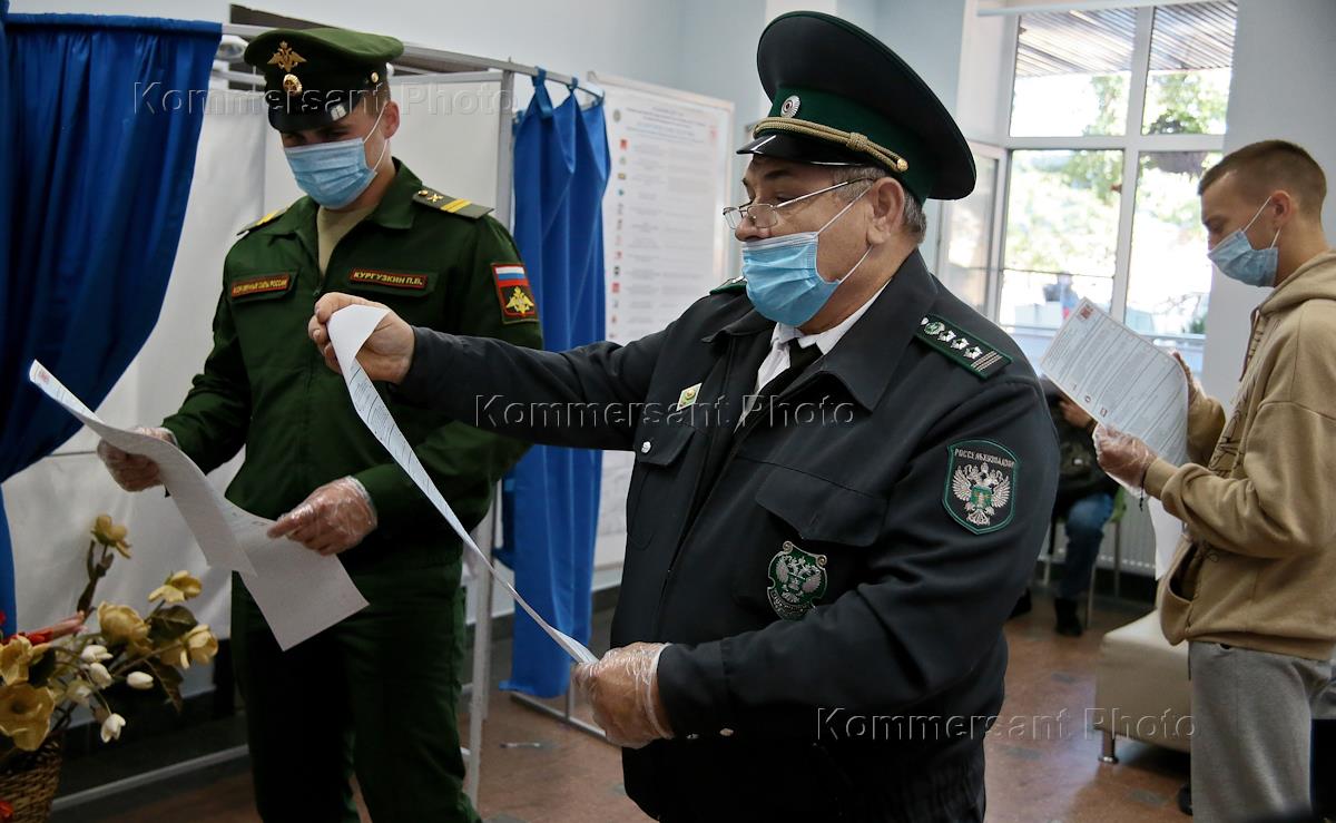 Выборы депутатов Государственной Думы России восьмого созыва и совмещенных с ними выборов и референдумов в субъектах Российской Федерации. Жанровая фотография. Военнослужащие во время голосования на избирательном участке в помещении средней школы №53 имени Б. Н. Слюсаря.