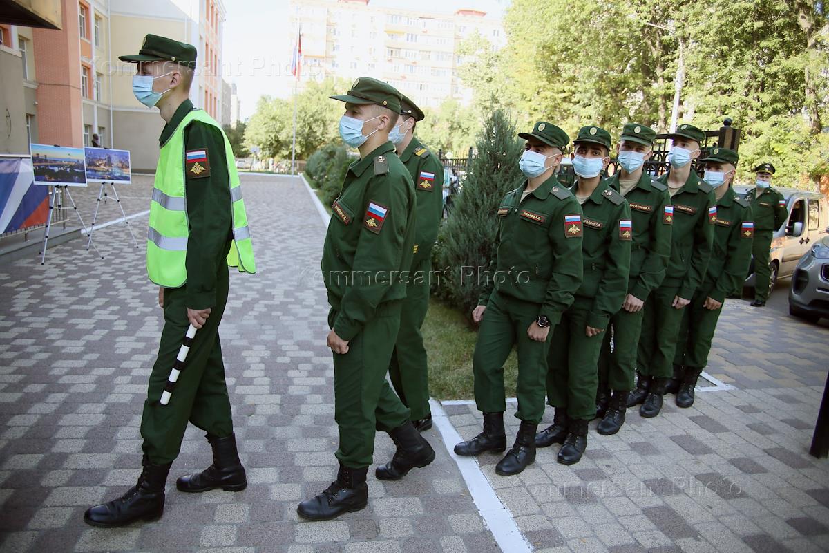 Выборы депутатов Государственной Думы России восьмого созыва и совмещенных с ними выборов и референдумов в субъектах Российской Федерации. Жанровая фотография. Военнослужащие в очереди перед входом на избирательный участок в помещении средней школы №53 имени Б. Н. Слюсаря.