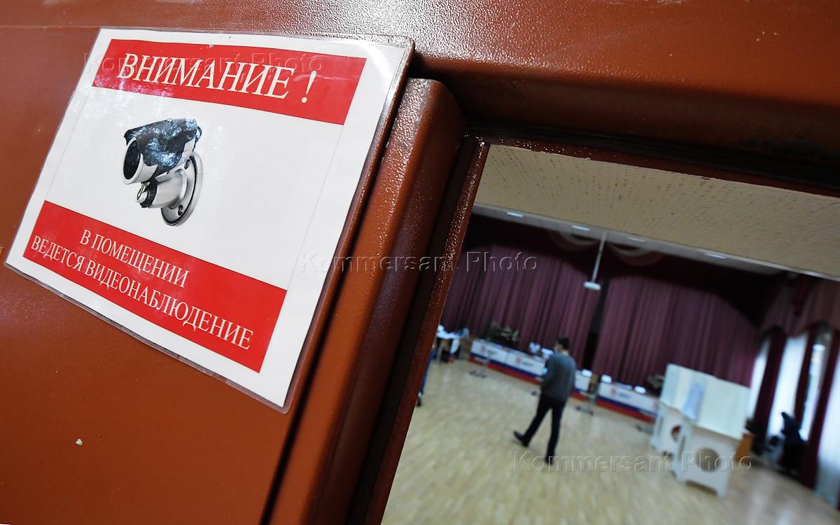 Выборы депутатов Государственной Думы России восьмого созыва и совмещенных с ними выборов и референдумов в субъектах Российской Федерации. Жанровая фотография. Объявление при входе на избирательный участок: "Внимание" В помещении ведется видеонаблюдение".