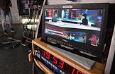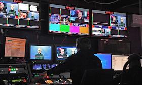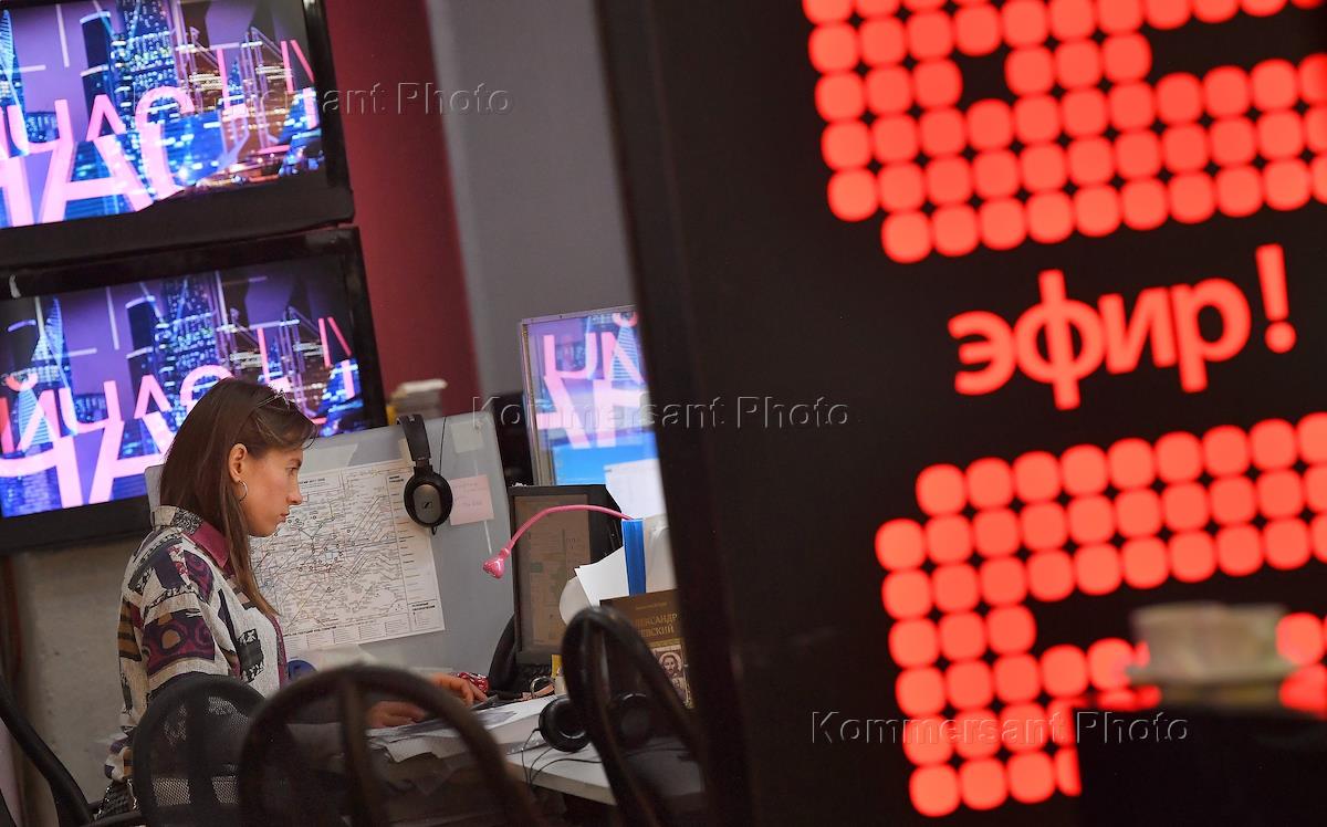 Телевизионная студия телеканала "Дождь". Жанровая фотография. Режиссер за пультом управления во время передачи.