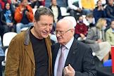 IX Благотворительный баскетбольный матч в поддержку детей с ДЦП в Баскет-холле "Москва" СК "Мегаспорт". Первый заместитель председателя Государственной Думы России Александр Жуков (слева) и член исполнительного комитета Российской федерации баскетбола (РФБ) Евгений Гомельский перед началом матча.