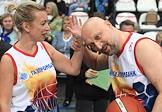 IX Благотворительный баскетбольный матч в поддержку детей с ДЦП в Баскет-холле "Москва" СК "Мегаспорт". Директор Департамента информации и печати МИД России Мария Захарова (слева) и председатель фонда "Сколково", президент Международной шахматной федерации (FIDE) Аркадий Дворкович (справа) во время матча.