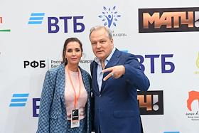 IX Благотворительный баскетбольный матч в поддержку детей с ДЦП в Баскет-холле "Москва" СК "Мегаспорт". Директор Департамента информации и печати МИД России Мария Захарова (слева) и актер Гоша Куценко (справа) перед началом матча.