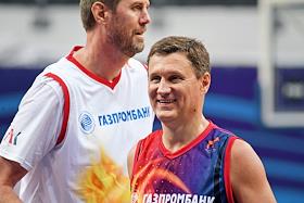 IX Благотворительный баскетбольный матч в поддержку детей с ДЦП в Баскет-холле "Москва" СК "Мегаспорт". Баскетболист Алексей Саврасенко (слева) и заместитель председателя Правительства России Александр Новак (слева) во время матча.