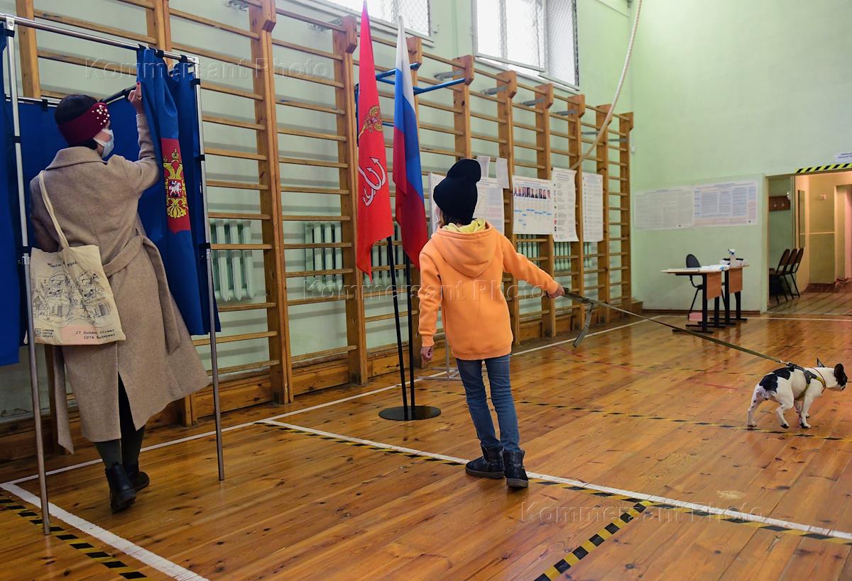 Выборы депутатов Государственной Думы России восьмого созыва и депутатов Законодательного собрания Санкт-Петербурга на двух избирательных участках в школе №169 Центрального района Санкт-Петербурга. Жанровая фотография. Избиратели во время голосвания на избирательном участке.