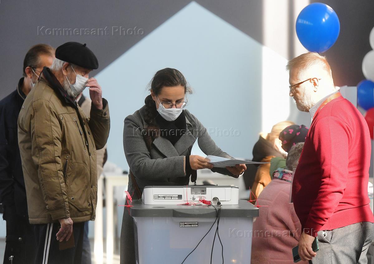 Единый день голосования. Выборы в Государственную думу России VIII созыва и депутатов Законодательного собрания Санкт-Петербурга. Избиратели во время голосования на избирательном участке.