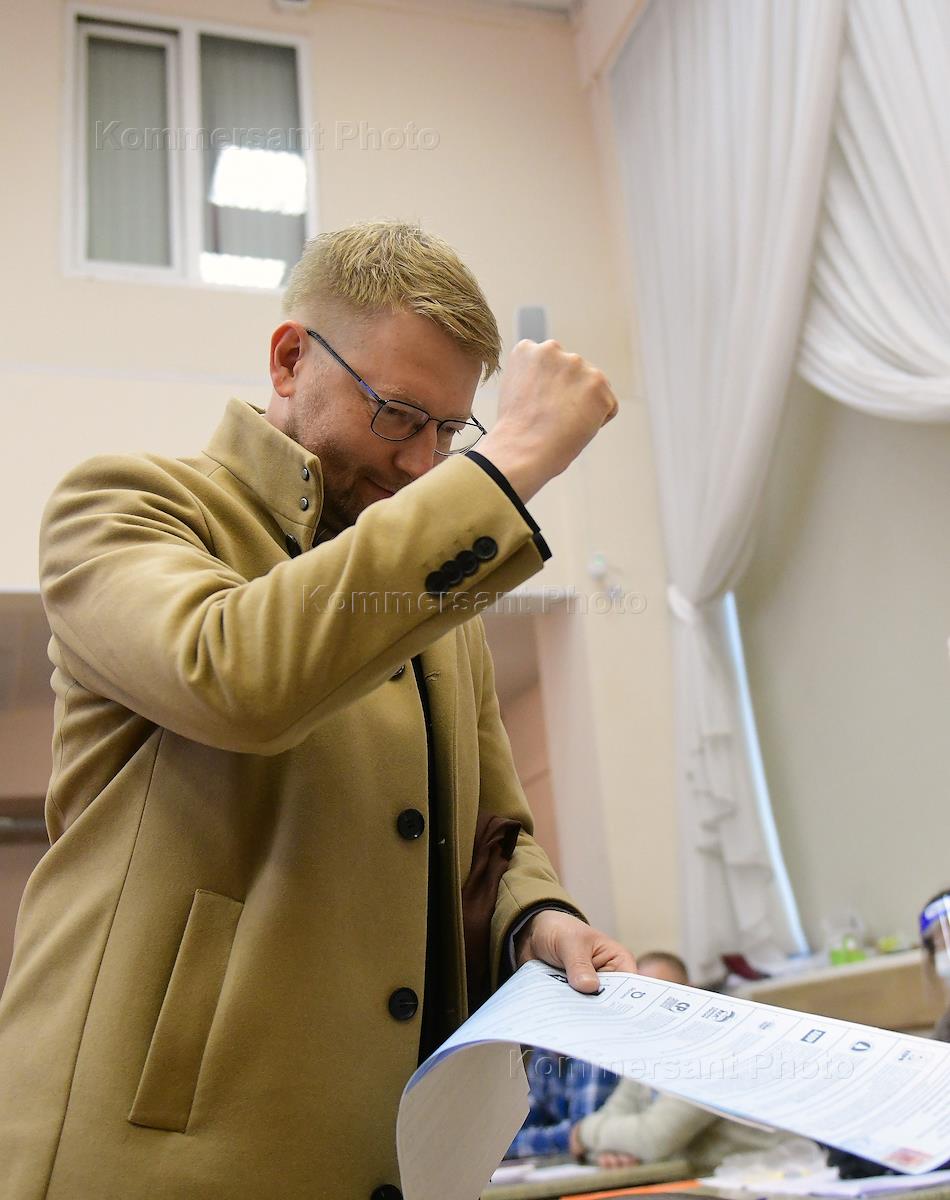 Единый день голосования. Выборы в Государственную думу России VIII созыва и депутатов Законодательного собрания Санкт-Петербурга. Председатель партии "Яблоко" Николай Рыбаков во время голосования на избирательном участке.