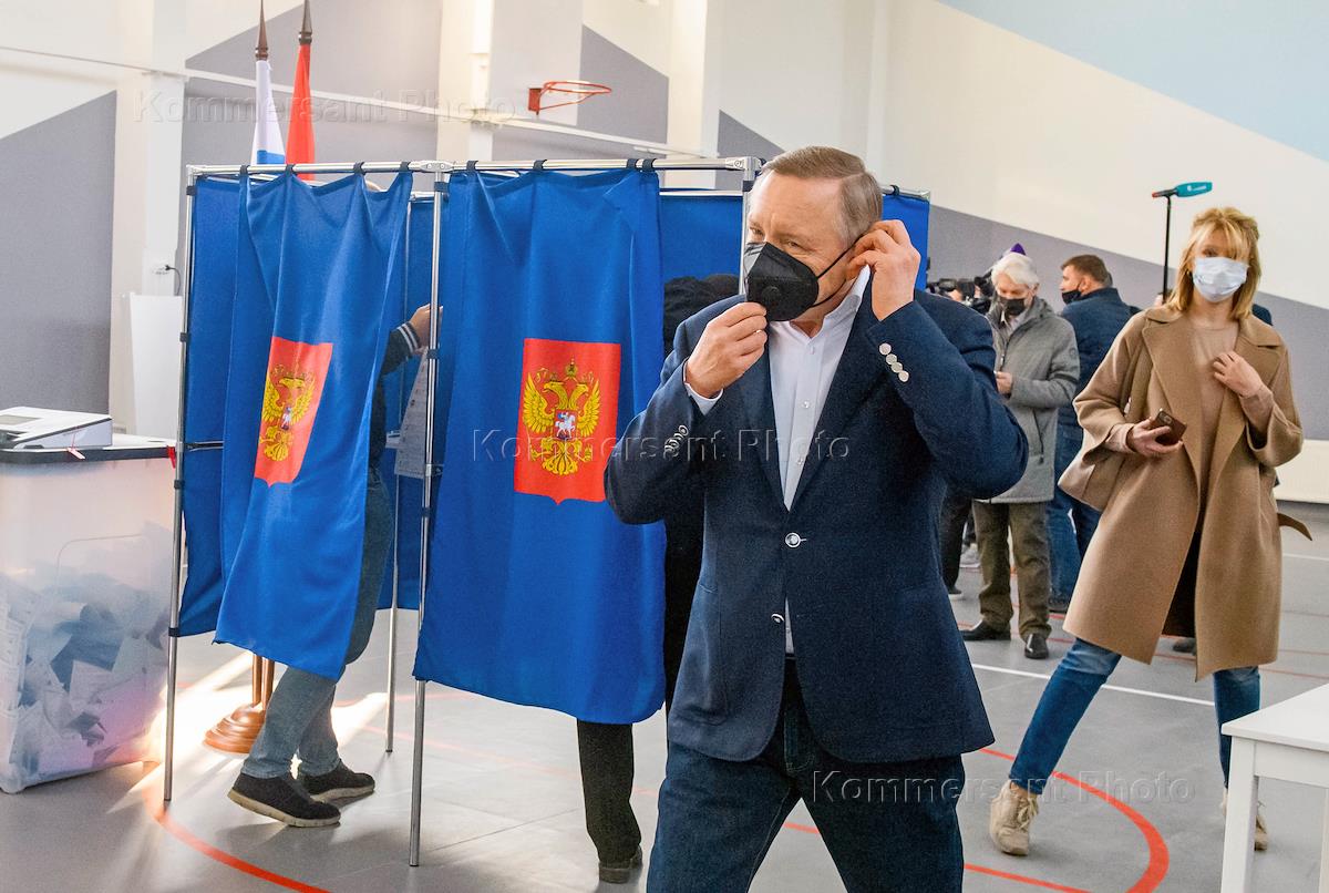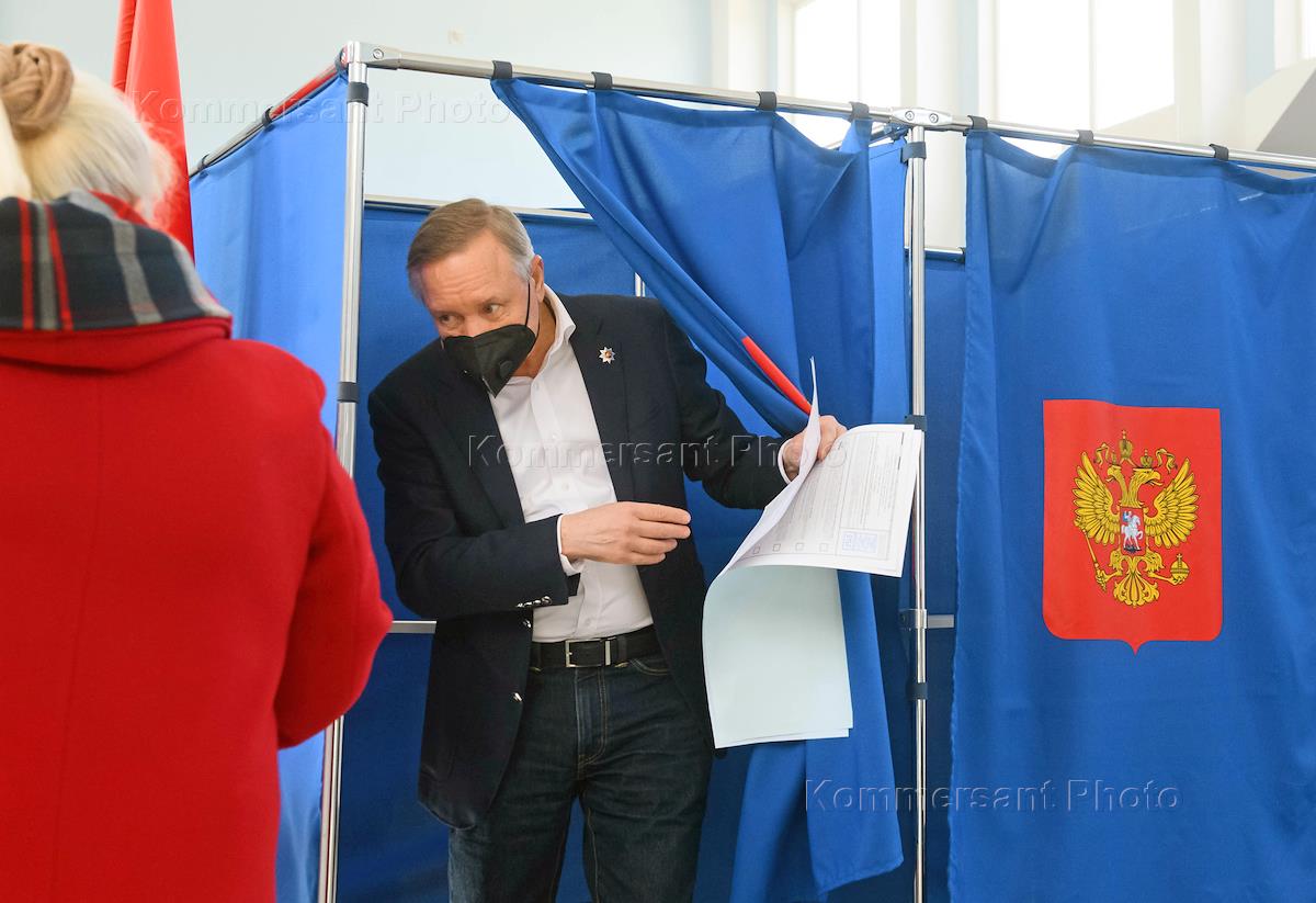 Единый день голосования. Выборы в Государственную думу России VIII созыва и депутатов Законодательного собрания Санкт-Петербурга. Губернатор Санкт-Петербурга Александр Беглов во время голосования на избирательном участке.
