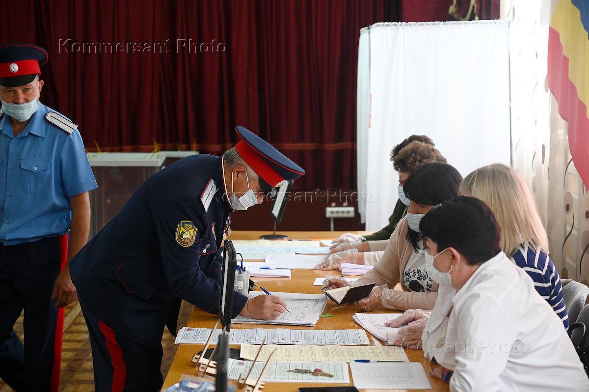 Единый день голосования. Выборы в Государственную думу России VIII созыва и совмещенные с ними выборы в субъектах России. Избиратели во время голосования на избирательном участке.