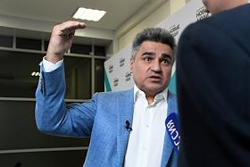 Единый день голосования. Выборы в Государственной думы России VIII созыва и совмещенных с ними выборов и референдумов в субъектах России. Брифинг партии "Новые люди" в офисе партии на улице Малая Якиманка. Председатель партии "Новые люди", основатель и президент научно-производственной компании Faberlic Алексей Нечаев (слева) во время брифинга.