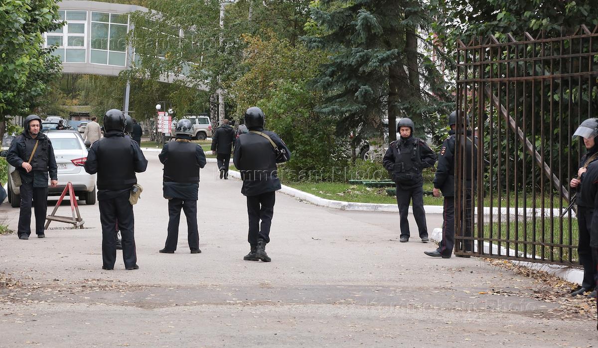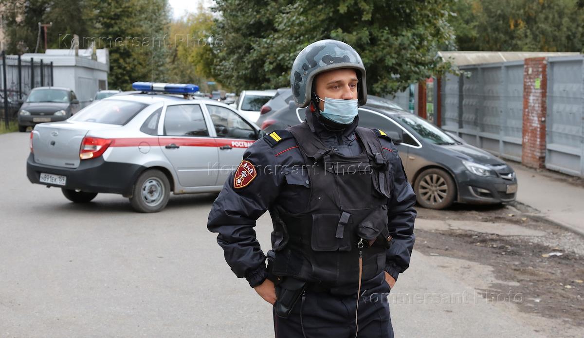 Стрельба в Пермском государственном национальном исследовательском университете на улице Генкеля (ПГНИУ). Сотрудники правоохранительных органов на месте происшествия возле здания ПГНИУ, где неизвестный устроил стрельбу в одном из корпусов.