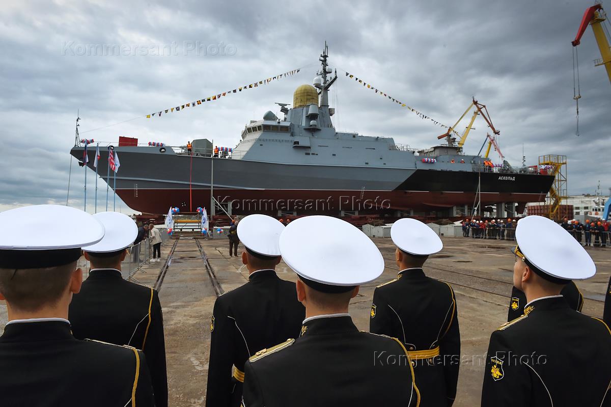 Церемония спуска на воду малого ракетного корабля "Аскольд" на воду на судостроительном заводе имени Б.Е.Бутомы.