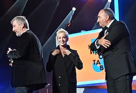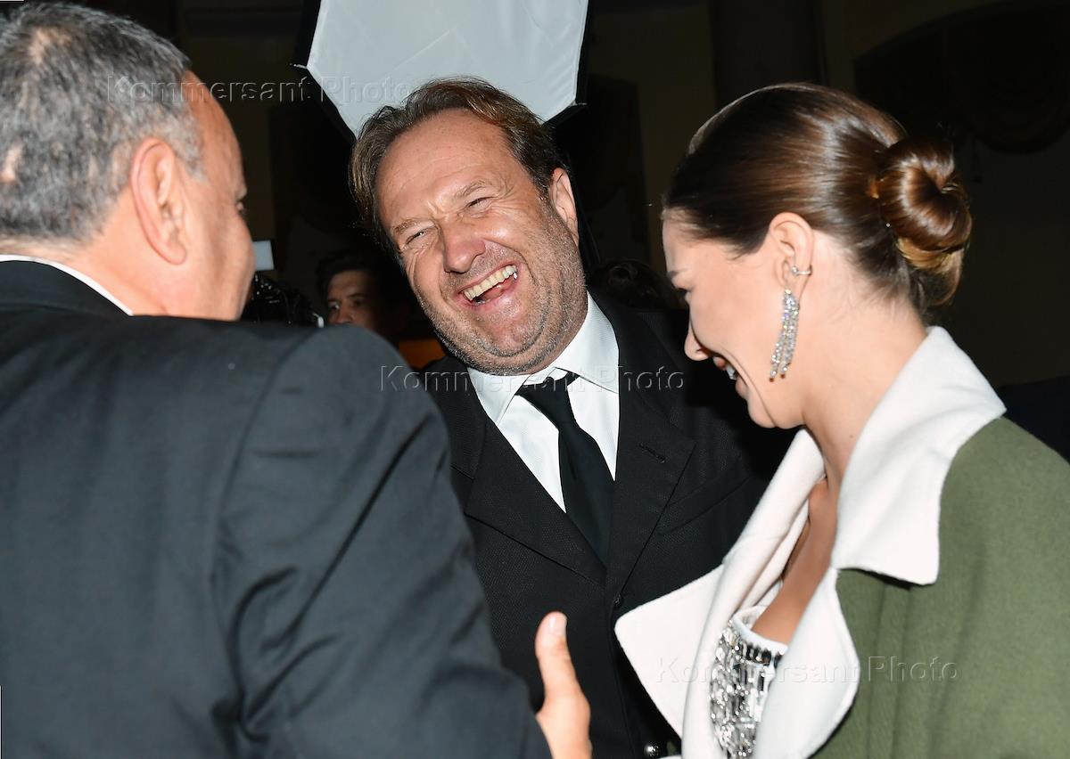 32-й Открытый Российский кинофестиваль (ОРКФ) "Кинотавр". Восьмой день. Церемония закрытия фестиваля в Зимнем театре. Справа налево: продюсер, медиа-менеджер, президент ОРКФ "Кинотавр" Александр Роднянский, актриса Чулпан Хаматова и режиссер Николай Хомерики во время церемонии.