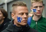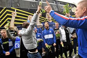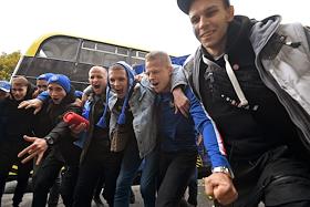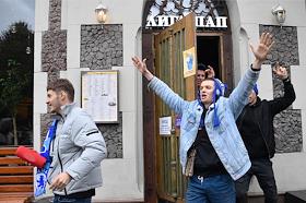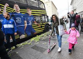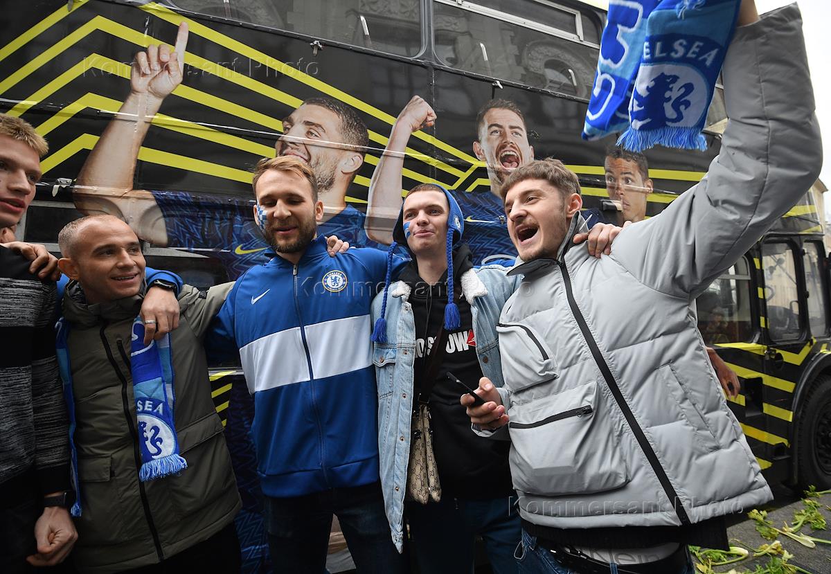 Перформанс болельщиков футбольного клуба "Челси" у спорт-бара "Лига Пап" перед матчем Чемпионата Англии между командами "Челси" и "Манчестер Сити".