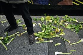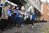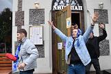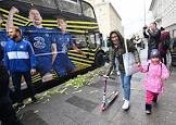 Перформанс болельщиков футбольного клуба "Челси" у спорт-бара "Лига Пап" перед матчем Чемпионата Англии между командами "Челси" и "Манчестер Сити". Прохожие во время перформанса.
