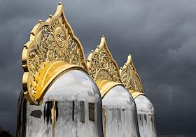 Виды Москвы. Жанровая фотография. Арт-объект семь зеркальных матрешек в золотых кокошниках напротив гостиницы "Украина" (Radisson Collection Hotel). Автор арт-проекта — Татьяна Ликсутова, архитектор — Николь Крихели.