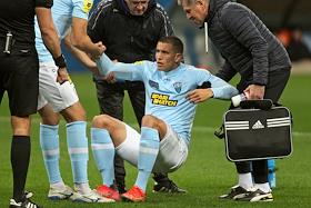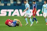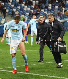 Российская Премьер-Лига (РПЛ). Тинькофф - Чемпионат России по футболу 2021/2022. 9-й тур. Матч между командами "Нижний Новгород" (Нижний Новгород) и ЦСКА (Москва) на стадионе "Нижний Новгород". Игрок команды "Нижний Новгород" Лукас Масоэро (в центре) во время оказания ему медицинской помощи.