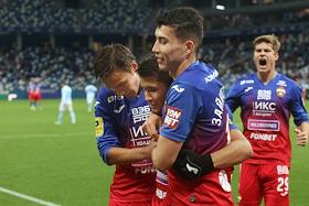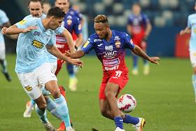 Российская Премьер-Лига (РПЛ). Тинькофф - Чемпионат России по футболу 2021/2022. 9-й тур. Матч между командами "Нижний Новгород" (Нижний Новгород) и ЦСКА (Москва) на стадионе "Нижний Новгород". Игрок команды "Нижний Новгород" Ричи Эннин(второй слева) во время матча.