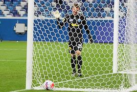 Российская Премьер-Лига (РПЛ). Тинькофф - Чемпионат России по футболу 2021/2022. 9-й тур. Матч между командами "Нижний Новгород" (Нижний Новгород) и ЦСКА (Москва) на стадионе "Нижний Новгород". Вратарь команды "Нижний Новгород" Артур Нигматуллин во время матча.
