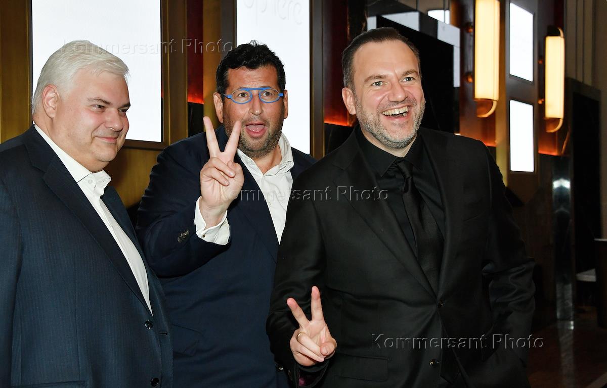 Торжественный прием в честь открытия клуба Sphere от Mastercard и VTB Privat Banking в кинотеатре "Художественный". Слева направо: глава Mastercard в России, Казахстане, Белоруссии и Армении Алексей Малиновский, предприниматель и сооснователь благотворительного фонда "Друзья" Ян Яновский и старший вице-президент, руководитель дирекции частного банковского обслуживания банка ВТБ Дмитрий Брейтенбихер на приеме.