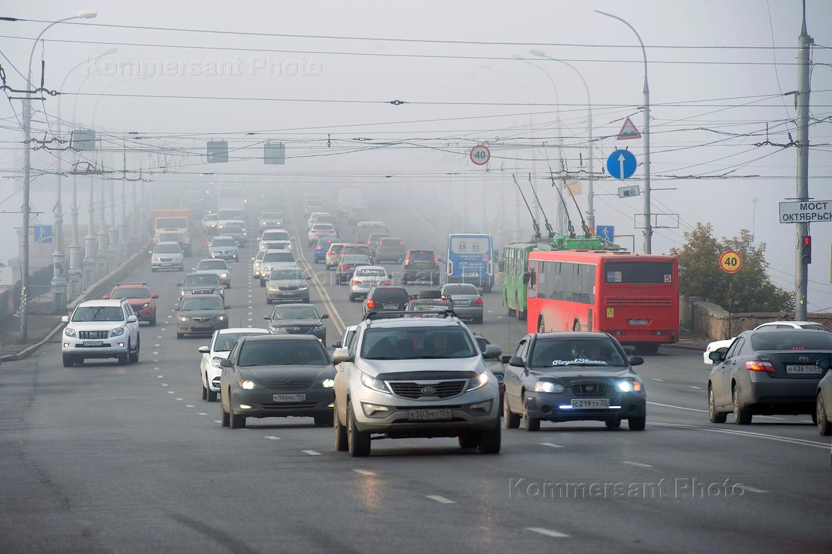 Виды Новосибирска. Дорожное движение на Октябрьском мосту во время тумана.