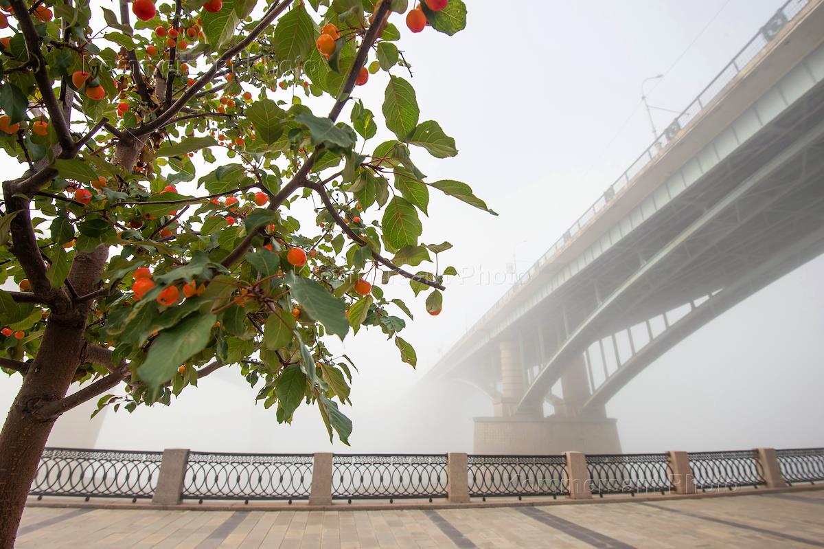 Виды Новосибирска. Яблоня сорта Ранетки на Михайловской набережной. Октябрьский мост в тумане.