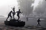 Виды Прокопьевска. Жанровая фотография. Пешеходы переходят улицу во время мокрого снегопада.