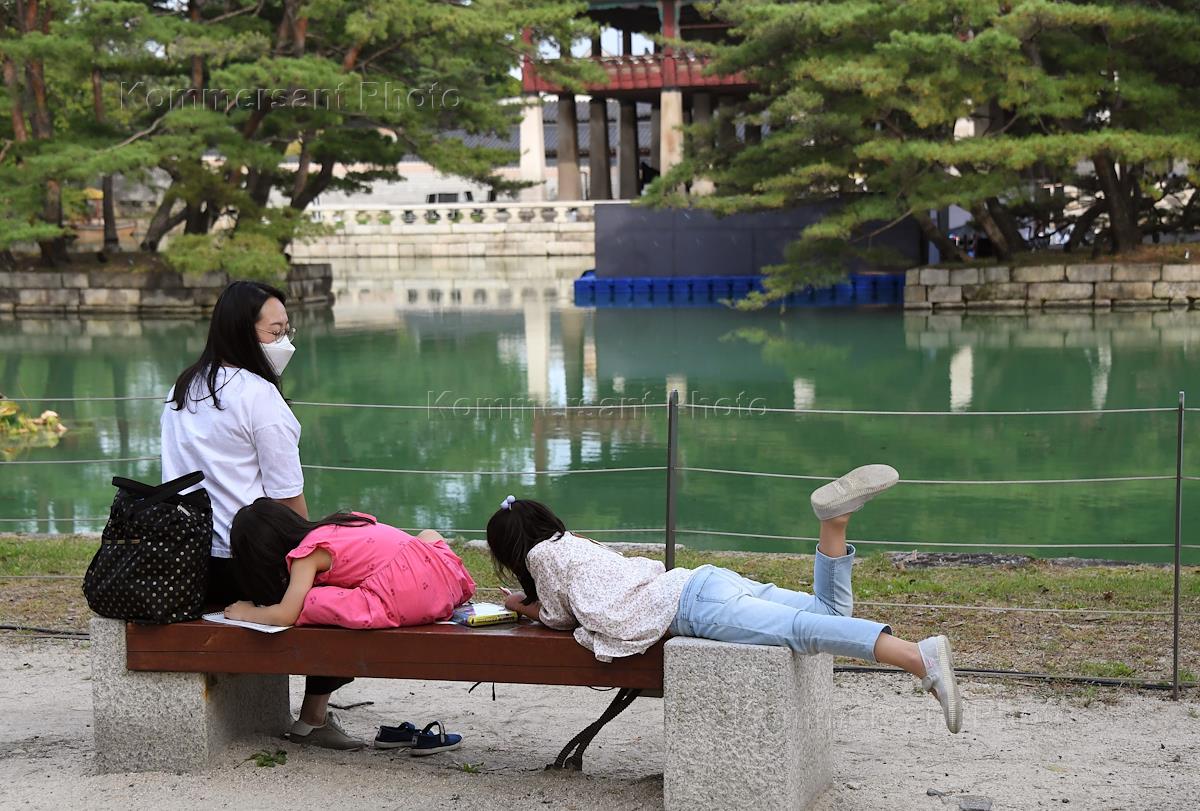 Seoul views. Genre photography. Girls in elegant dresses in the park on the bench.