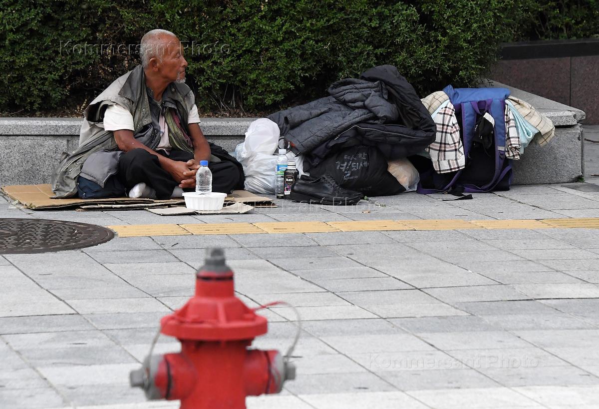 Виды Сеула. Жанровая фотография. Мужчина с вещами сидит на тротуаре.