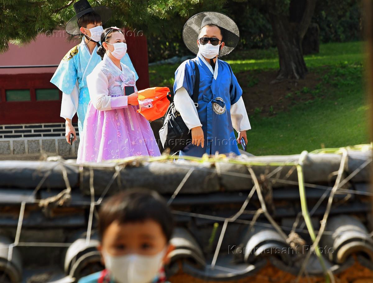 Seoul views. Genre photography. Girls in national clothes and hats.