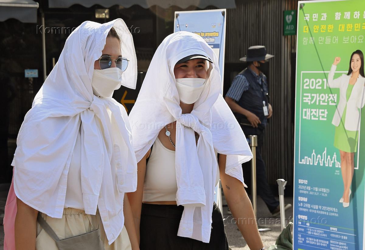 Seoul views. Genre photography. Women in shirts thrown over their heads and medical masks.