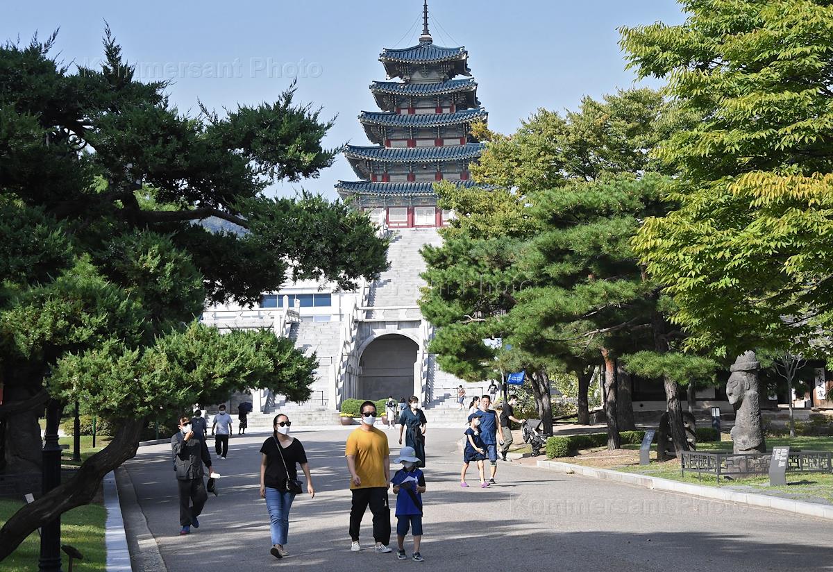 Seoul views. Genre photography. A man and a woman in national clothes on the background of the pagoda.