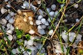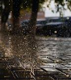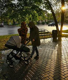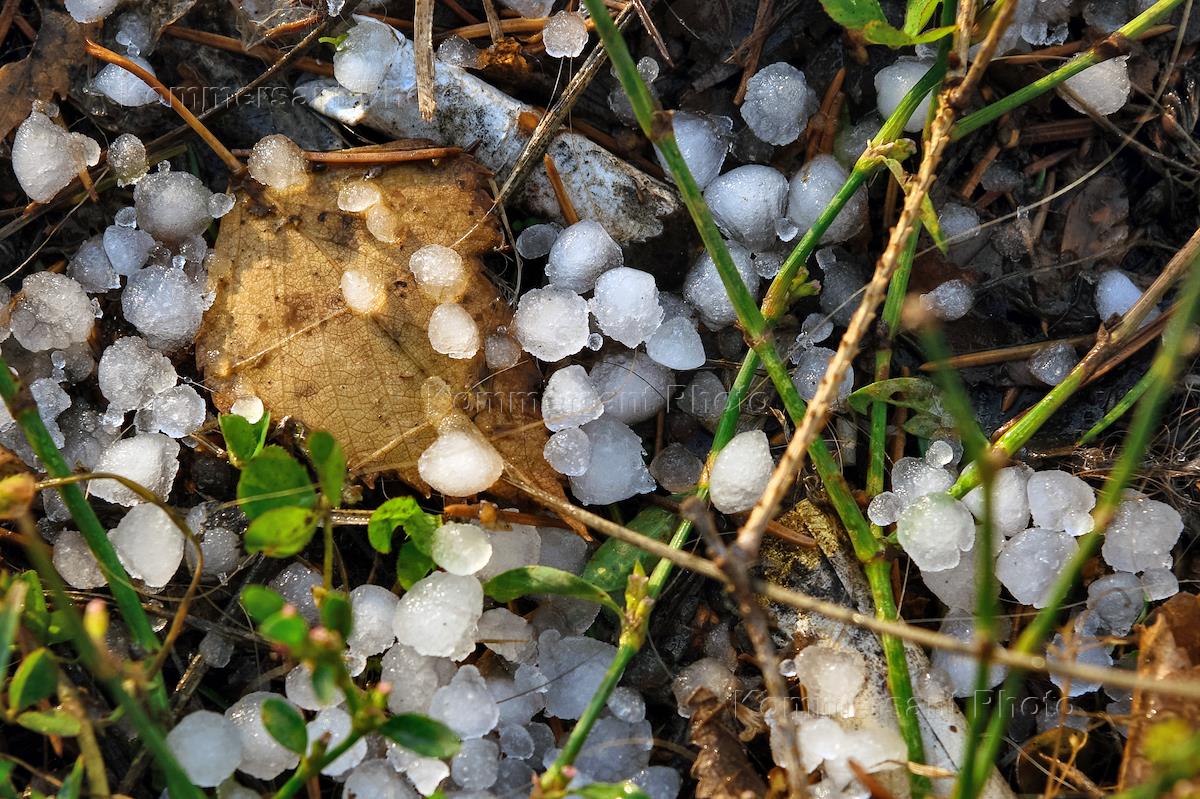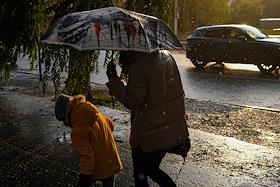 Genre photography. Mom and daughter under an umbrella during the rain and hail.