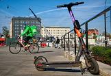 Виды Москвы. Жанровая фотография. Курьер службы доставки Delivery Club на велосипеде и припаркованный прокатный самокат.