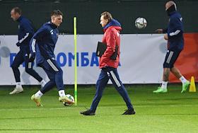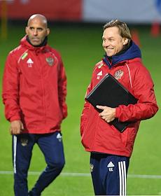 Открытая тренировка сборной России по футболу, посвященная подготовке национальной сборной к отборочным матчам чемпионата мира 2022 года со Словакией и Словенией, в УТЦ "Новогорск". Главный тренер сборной России по футболу Валерий Карпин (справа) во время тренировки.