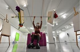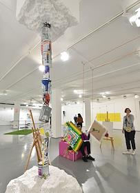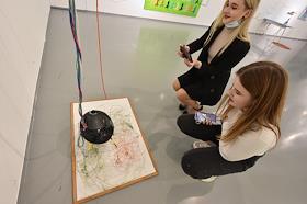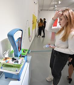 Церемония открытия 25-го сезона в Мультимедиа Арт Музее. Семь выставок, представляющих главные направления работы музея за 25 лет. Жанровая фотография. Посетители во время осмотра выставки арт-группы "ЕлиКука" "Сила искусства. Просроченный юбилей".